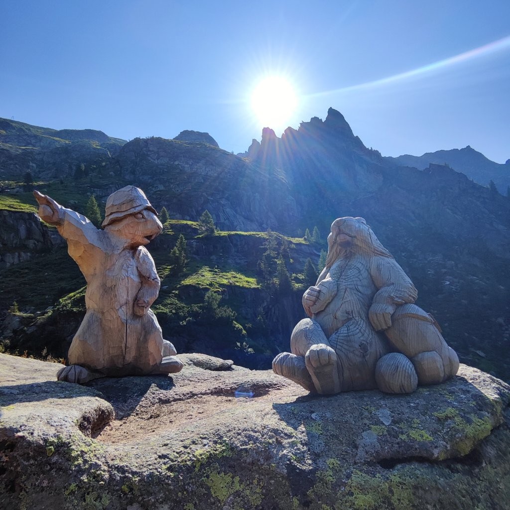 Vom Rifugio Cima d´Asta steigt man durch typische granitische Felsen ins Tal herab. Der Weg wird ist mit aus Holz geschnitzten Murmeltieren geschmückt und läd zu der ein oder anderen Fotopause ein. Im Tal angekommen, bringt uns ein schattiger Waldweg zurück zu unserem Startpunkt, der Malga Sorgazza. Bei einem erfrischenden Getränk, können wir das Wochenende Revue passieren lassen.