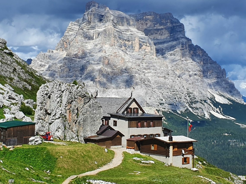 Ein weiteres Highlight wartet auf uns. Wir steigen auf historischen Wegen der ehemaligen Dolomitenfront durch die Galleria de Lagazoui hinab. Wirklich beeindruckend, wie das Leben zu dieser Zeit direkt an der Dolomitenfront war. Über Wiesenwege geht es gemütlich hinab bis zur Seilbahn, die uns den Aufstieg zur Scoiattoli Hütte erleichtert. Nach einer Rast starten wir in Richtung Cinque Torri Hütte. Über schönes Wiesengelände geht es hinüber zu unserer am Lago Federa gelegenen Unterkunft.