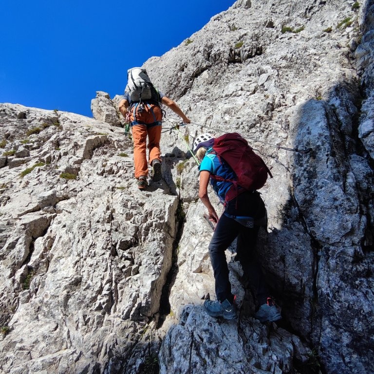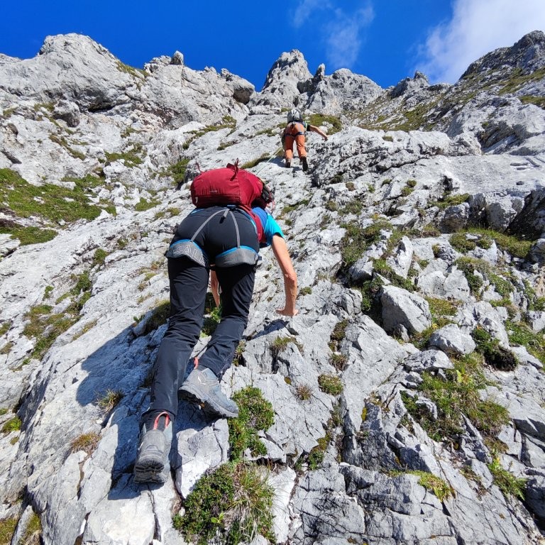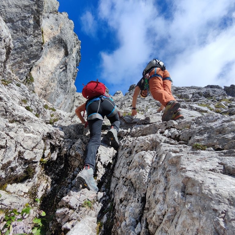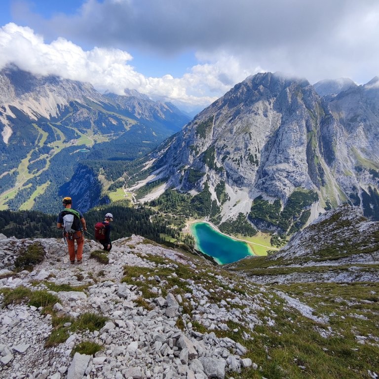 Zügig geht es an der Coburger Hütte vorbei Richtung Biberwier Scharte. Ab einer Höhe von 1.950 m legen wir die Kletterausrüstung an. Jetzt wird es interessant. Es folgt eine spannende und zum Teil sehr ausgesetzte, luftige Kletterei am vorwiegend griffigen Fels von etwa 500 Höhenmeter. Die etwa 2 Stunden vollste Konzentration werden mit einem grandiosen Ausblick am Gipfel belohnt. Wir bestaunen das Zugspitzmassiv, das Loisachtal und die Ammergauer- und Lechtaler Alpen.