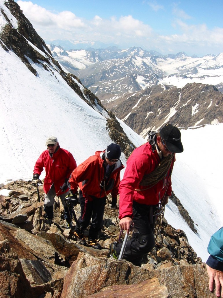 Am zweiten Tag wartet dann unser Highlight: die Besteigung der Wildspitze auf 3.768 m (höchster Berg der Ötztaler Alpen) in selbständigen Seilschaften. Über das Mitterkar und Mittekarferner führt uns der Weg über Gletscher. Jetzt wird es felsig und Blockgelände muss überwunden werden.